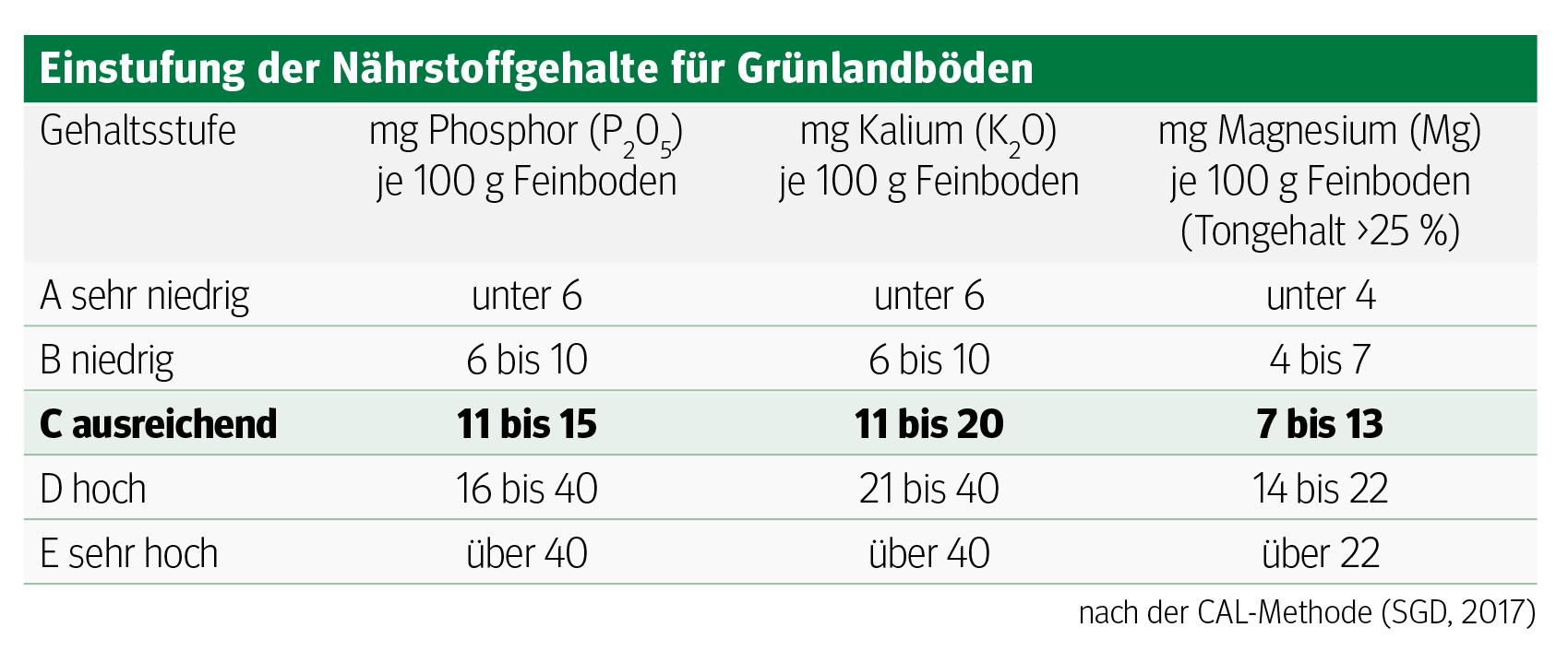 Anzustreben ist generell die Versorgungsstufe C. Die empfohlene Düngemenge orientiert sich in dieser Stufe an dem Nährstoffentzug in der jeweiligen Ertragslage. In der Gehaltsstufe B wird ein Zuschlag von 25 % bzw. in der Stufe A von 50 % empfohlen. Die Düngeempfehlungswerte können der Richtlinie für die sachgerechte Düngung entnommen werden. Die Broschüre ist auf der jeweiligen Homepage der Landwirtschaftskammer zu finden.