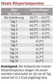 Mit fortschreitendem Lebensalter steigt diese dann auf etwas über 41 Grad an (Tabelle links). Besonders wichtig ist hier auch die Bodentemperatur des Stalles. Dieser muss vor der Einstallung der Küken auf alle Fälle ausreichend erwärmt sein (die Temperatur liegt idealerweise bei mindestens 29 bis 30 Grad direkt am Boden gemessen), um die Gesundheit der Küken nicht zu gefährden.