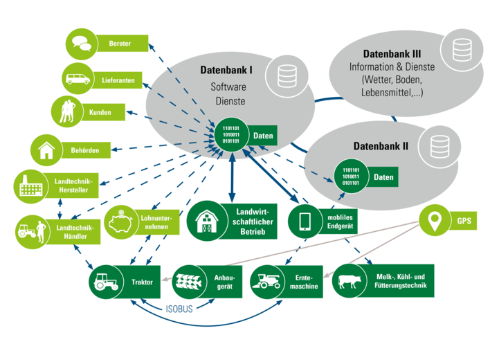 Zur Digitalisierung in der Landwirtschaft gehören "Smart Farming“ und "Precision Farming“. Bei "Smart Farming“ werden landwirtschaftliche Daten untereinander vernetzt. Hier könnten zum Beispiel GPS-Daten mit Anbaudaten einer Kultur verbunden werden, die zu einem späteren Zeitpunkt für andere Maschinen wieder eingelesen werden können.