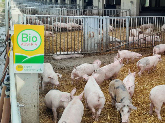 Auf den Flächen eines Bio-Schweinehalters wachsen meist vier bis sechs Kulturen. Neben Getreide und Mais sind das oft noch Soja- und Ackerbohnen. Sind zu wenig Flächen vorhanden, wird von anderen Bio-Betrieben zugekauft. Damit kann die Ration von Mastschweinen ganz artgerecht und schmackhaft gestaltet werden. Mineralstoffe werden jedenfalls zugekauft, um die Tiergesundheit sicher zu stellen. Damit wachsen Bio-Schweine auch nicht langsamer, aber länger. Sie werden ohne Preisabschlag bis zu 120 Kilo Schlachtgewicht schwer.