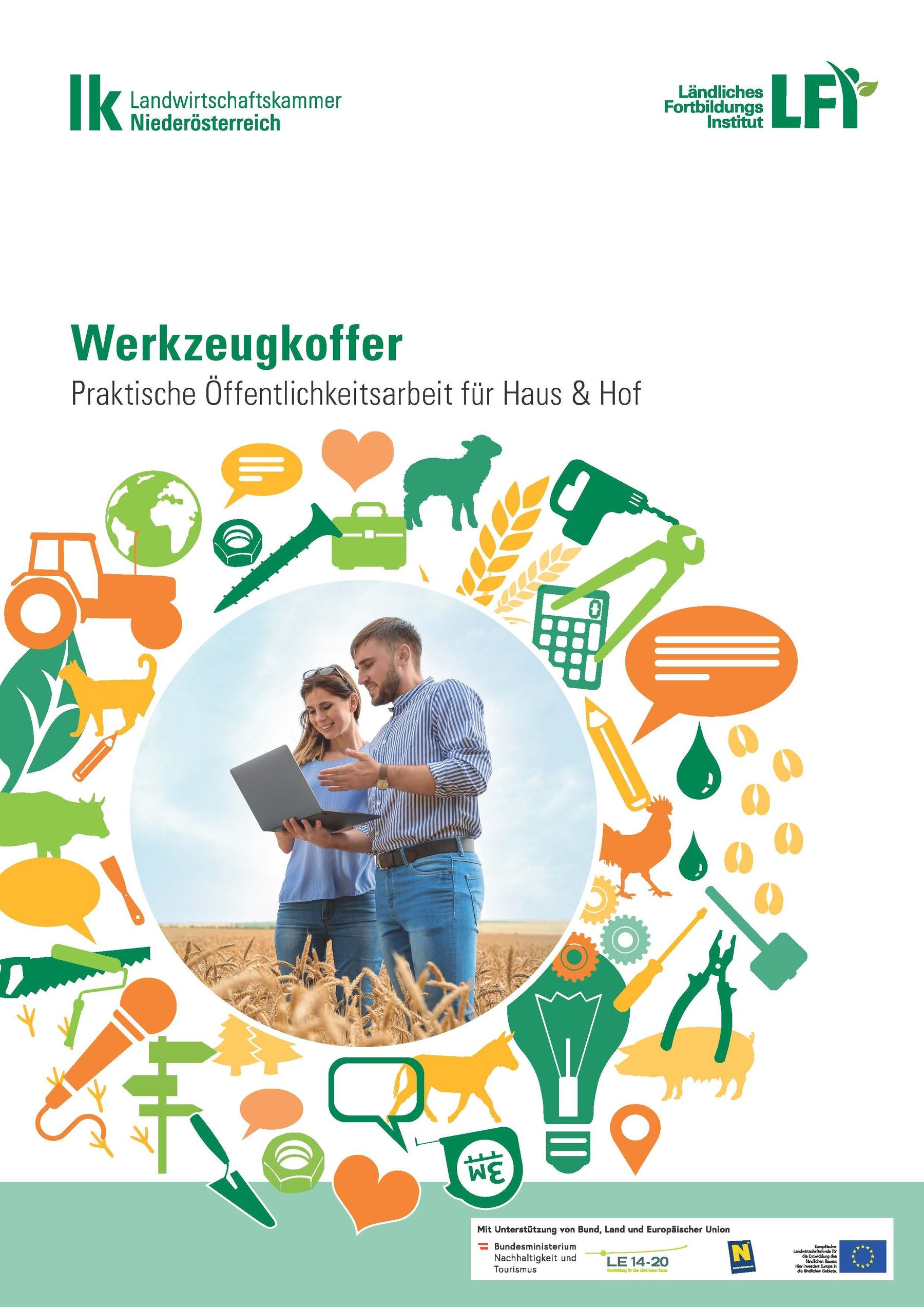 Die Broschüre „Werkzeugkoffer“ bündelt Grundlagen und Ideen rund um den Dialog mit der Gesellschaft. Sie beinhaltet Grundlagen der Kommunikation und Öffentlichkeitsarbeit, Ideen für einen aktiven Dialog, rechtliche Rahmenbedingungen für Veranstaltungen am Hof und stellt diverse Initiativen zum Mitmachen, Gütesiegel und Qualitätsprogramme sowie Angebote der Landwirtschaftskammer NÖ vor. Öffentlichkeitsarbeit ist nicht immer mit großem Aufwand verbunden, sondern kann manchmal auch ganz nebenbei passieren. Bestimmt sind auch für Ihren Betrieb die passenden Werkzeuge dabei.