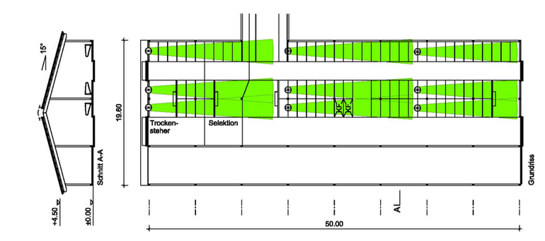 Bei einer Querlüftung bietet es sich meist gut an, die Ventilatoren über dem Fressgitter zu montieren. Hier wird zwar weniger Frischluft angesaugt, aber es werden mehr Liegeboxen gekühlt. Bei Montage der Ventilatoren an der Liegeboxen-Außenwand ist die Frischluftzufuhr besser, aber weniger Liegeboxen profitieren davon.