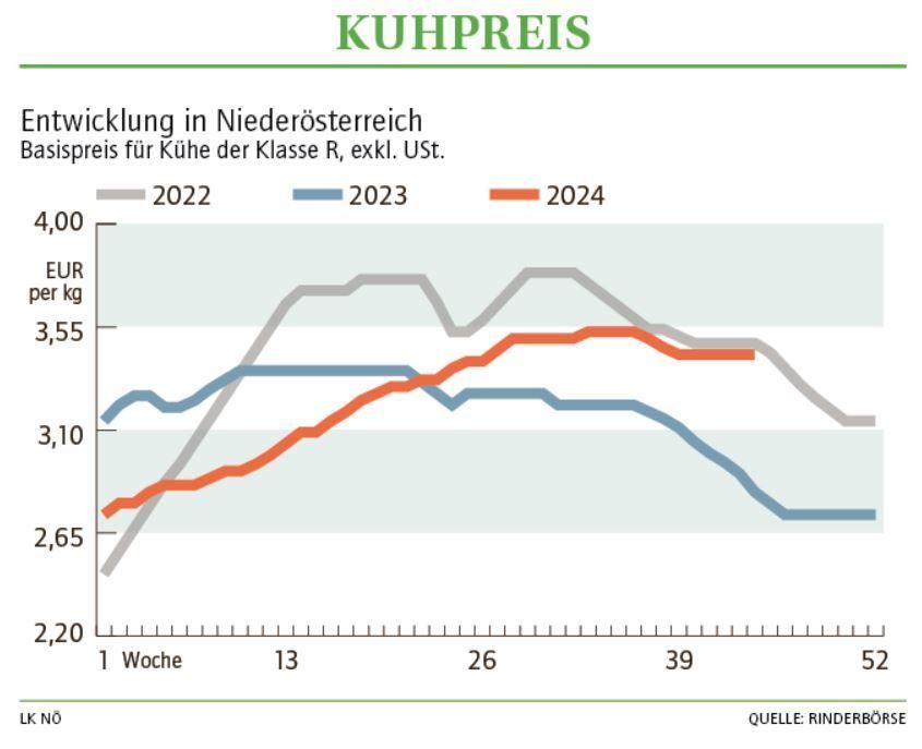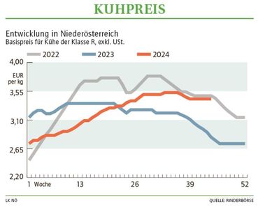 Die Stimmung am EU-Rindermarkt ist besonders für Schlachtstiere weiter positiv, denn das Angebot ist fortgesetzt eher knapp - Auch in Niederösterreich liegt die Zahl der angebotenen Stiere leicht unter dem Bedarf - Die hohe Zahl an schweren Tieren deutet darauf hin, dass Tiere auch zurückgehalten werden - Besonderer Bedarf würde dagegen bei Stieren in AMA-Qualität bestehen - Insgesamt ist die Absatzsituation wie in den Vorwochen zügig - Nach den jüngsten Preisverbesserungen kam es diese Woche zu einer Marktkonsolidierung mit stabilen Preisen - Aus Deutschland wird fortgesetzt von einem kleinen Angebot berichtet - Auch wenn die Ware weiter gut nachgefragt ist, nahm die Bereitschaft der Abnehmer, steigende Preise zu akzeptieren, zuletzt ab - So zogen die Preise neuerlich an, aber in abgeschwächtem Ausmaß - In einem ausgeglichenen Verhältnis befinden sich Angebot und Nachfrage bei Schlachtkühen, sodass die Preise in Deutschland stabil blieben - Hierzulande lässt sich das durchschnittliche Kuhaufkommen ebenfalls laufend vermarkten und die Notierung blieb unverändert - Ebenfalls zu keiner Preisänderung kam es bei Schlachtkalbinnen - Die NÖ Rinderbörse bezahlt für Schlachtstiere der Klasse U einen Basispreis von 4,99 Euro (unverändert) und der Klasse R von 4,92 Euro pro kg plus USt.