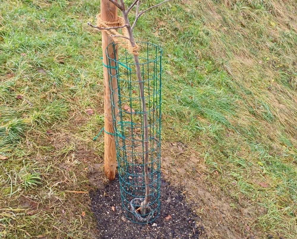 Der Stammschutz bei Obstbäumen ist gerade im Winter wichtig, um Wildverbiss zu vermeiden. Die Kontrolle auf Vollständigkeit ist daher jetzt notwendig. Gitterkörbe um den Stamm lassen Licht und Luft an die Rinde und gewährleisten mechanischen Schutz.